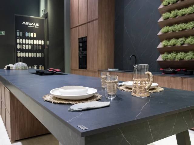 Ascale Allure Black to spiek kwarcowy inspirowany wyrafinowaną paletą tonów czekoladowych, o stonowanym i eleganckim charakterze. Ciemnobrązowe tło materiału, wzbogacone subtelnymi żyłkami z szarymi i oksydowymi refleksami, tworzy delikatny i wyważony rysunek, który wnosi do wnętrz harmonię i spokój.