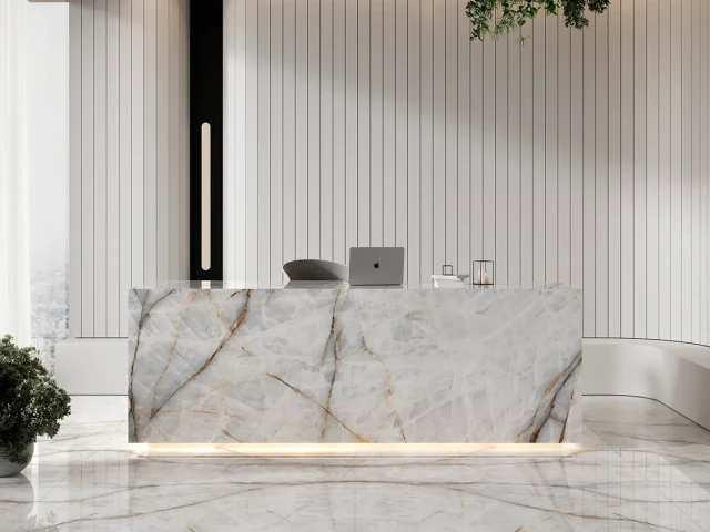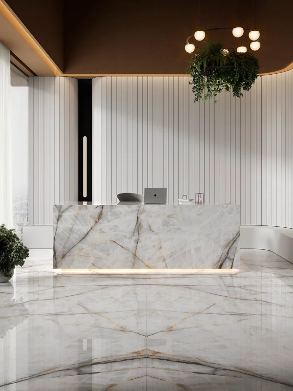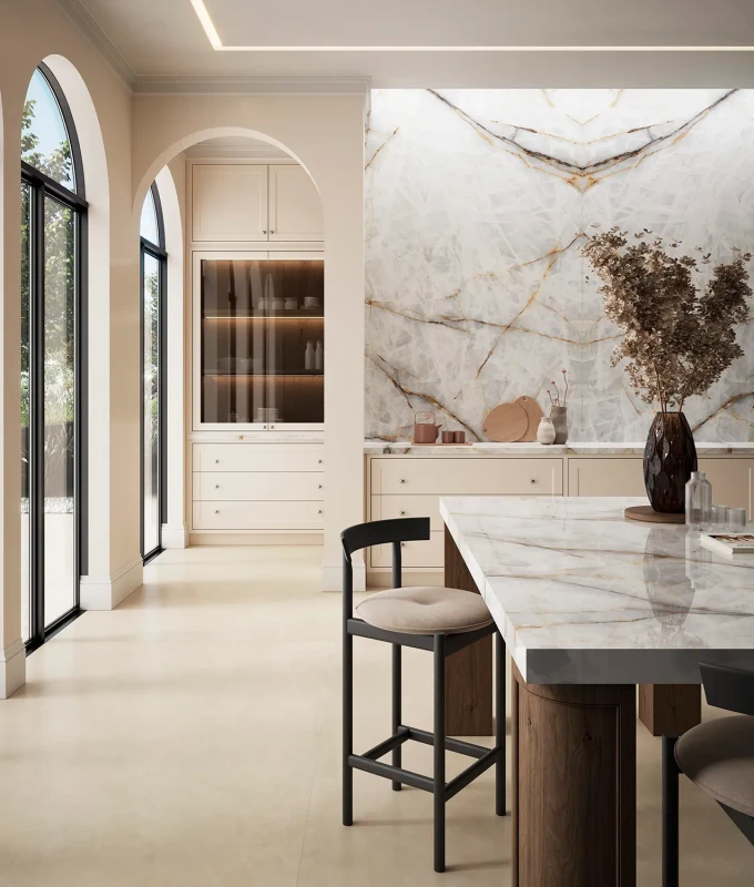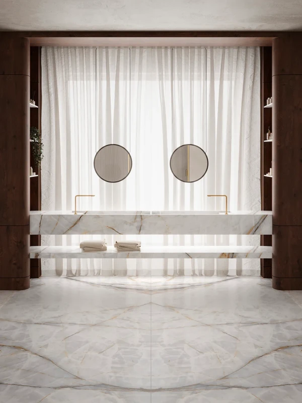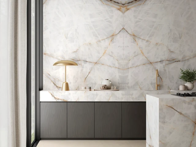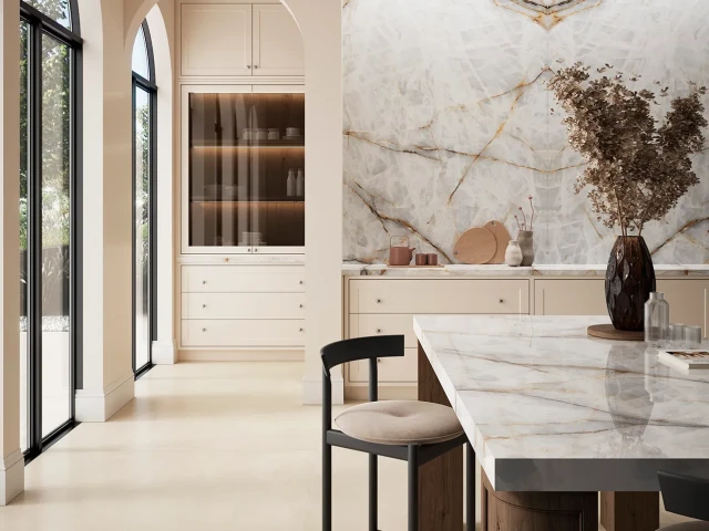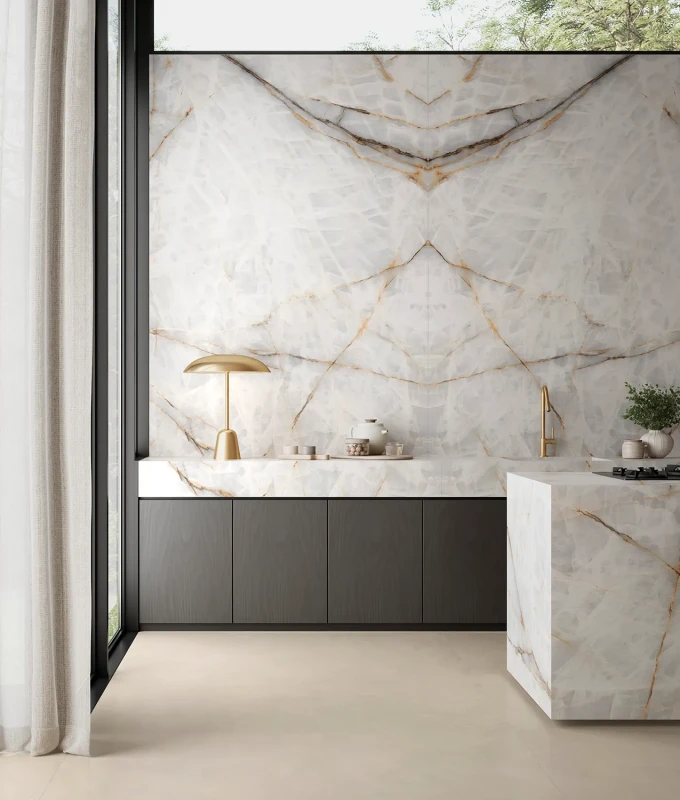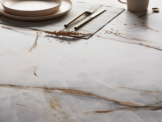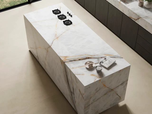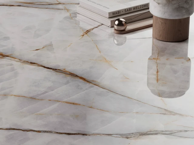 Ascale Aura Lux White to artystyczna interpretacja natury zamknięta w kamieniu, powierzchnia, która opowiada historię światła, ruchu i szlachetnej elegancji. Jasna, świetlista baza stanowi tło dla wyrafinowanego rysunku żył w odcieniach ochry i szarości, które przenikają się na powierzchni, tworząc efekt głębi i wyrazistego charakteru.
