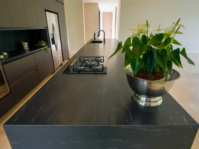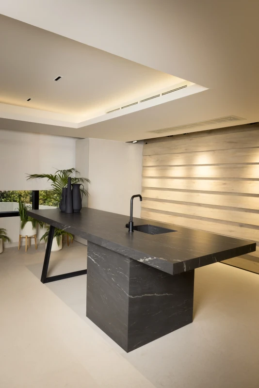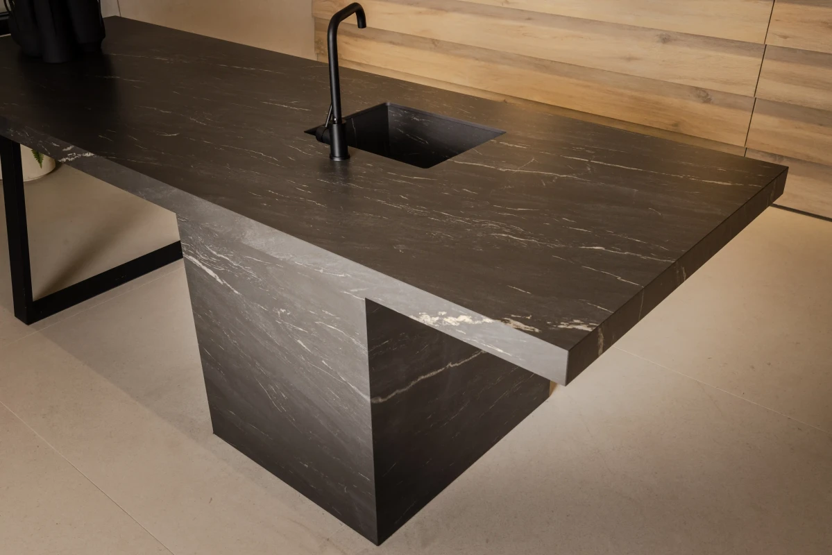 Materiał doskonale komponuje się z drewnem, metalem oraz szkłem, tworząc nowoczesne, ciepłe i eleganckie aranżacje.