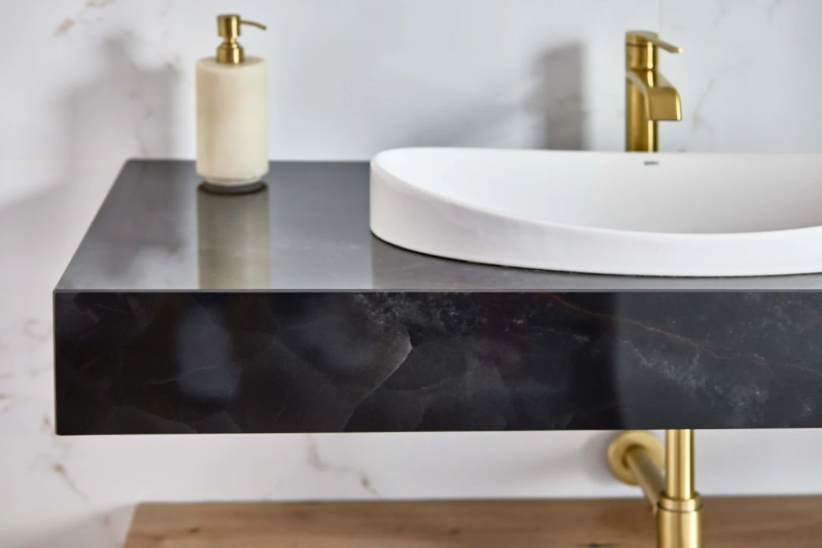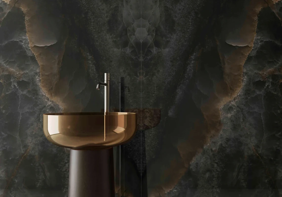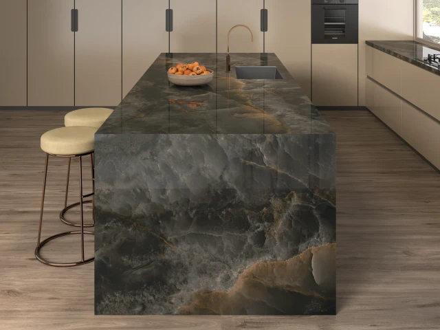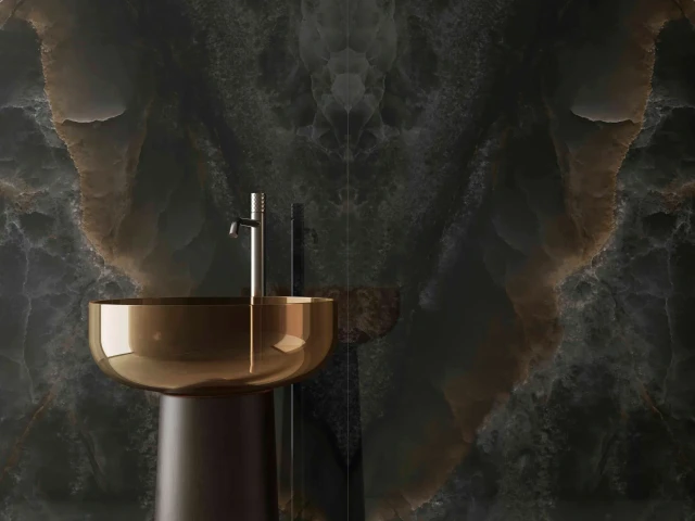 Ascale Onice Black to powierzchnia o imponującej i wyrafinowanej obecności, która uosabia najbardziej odważną i rzeźbiarską odsłonę elegancji inspirowanej minerałami. Głęboka, intensywna czerń stanowi tło dla delikatnych złotych żył, przecinających powierzchnię niczym smugi światła i tworzących kontrast o niezwykle silnym oddziaływaniu wizualnym.
