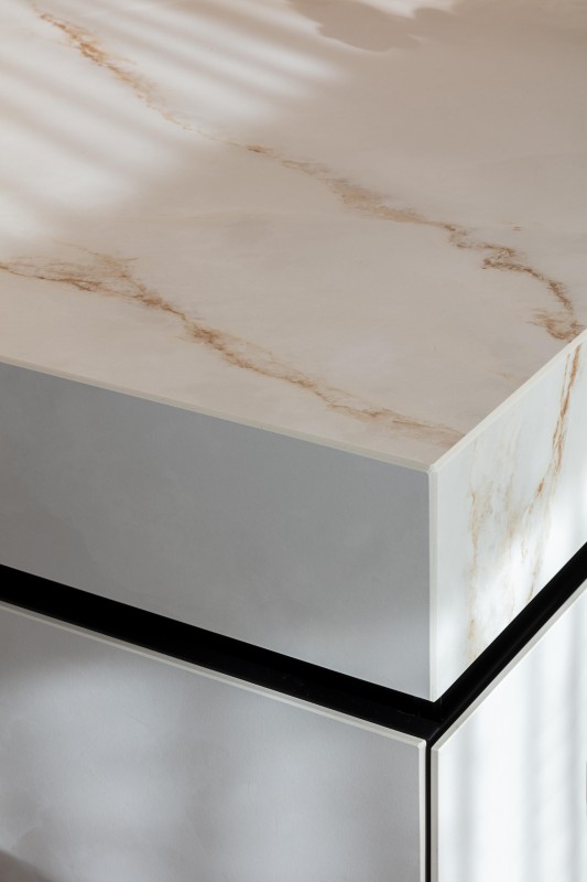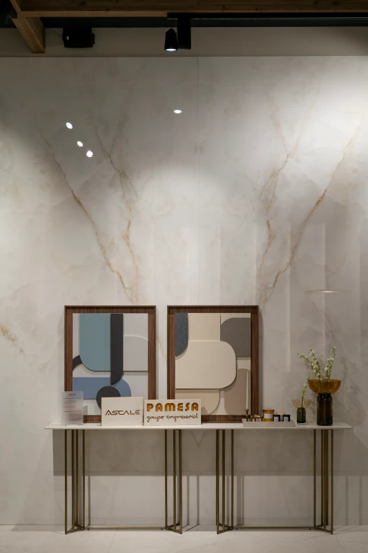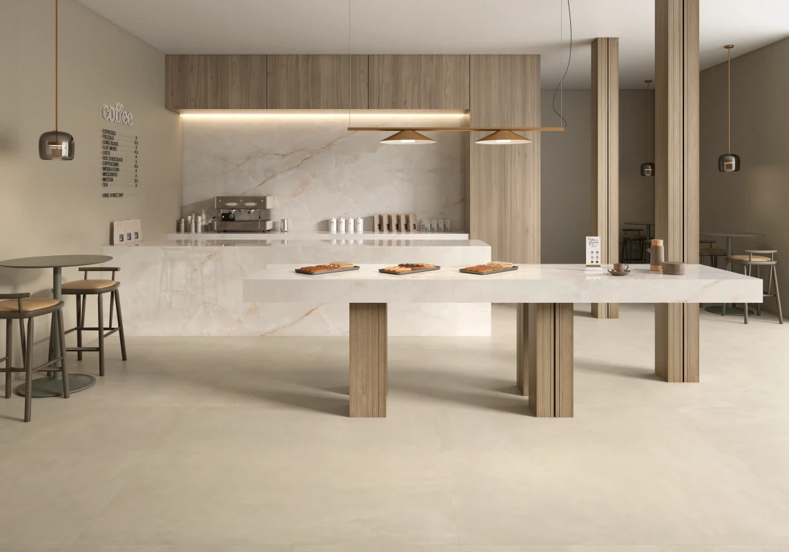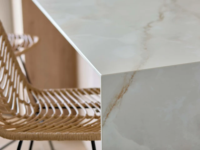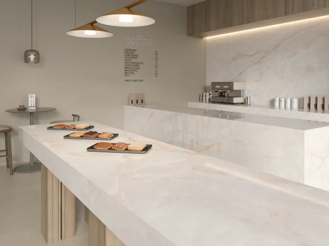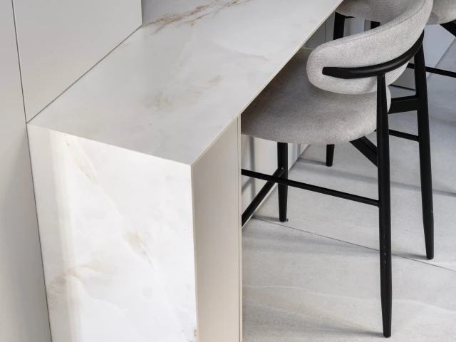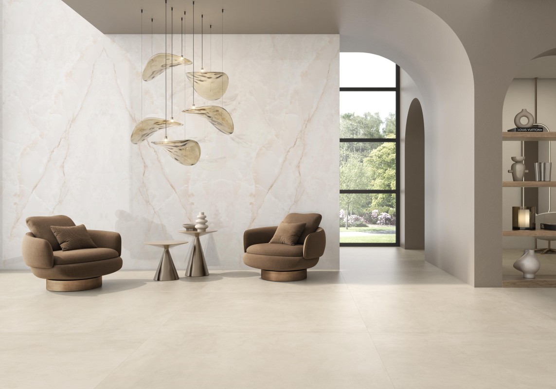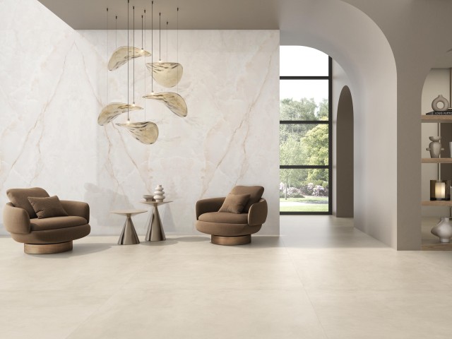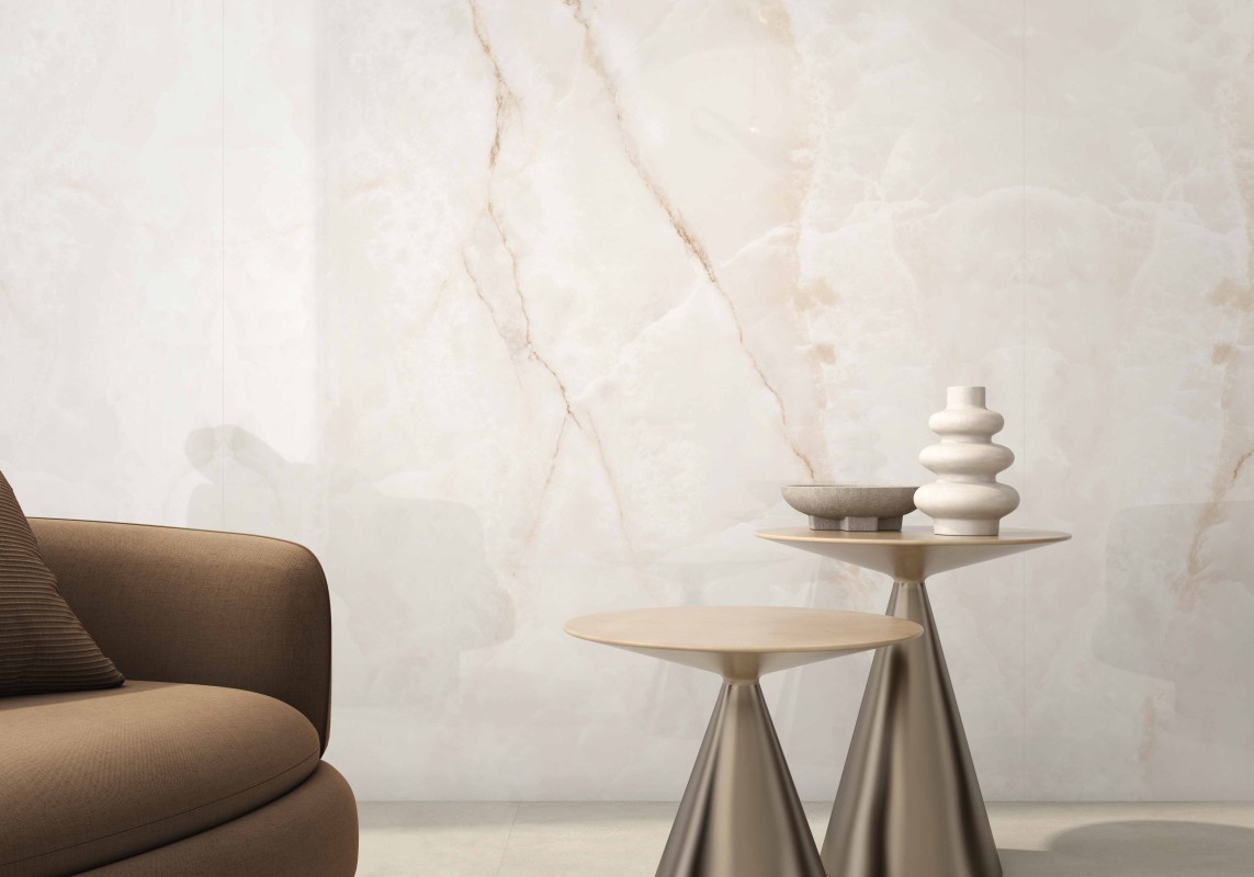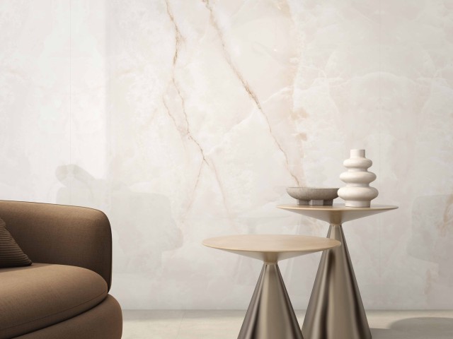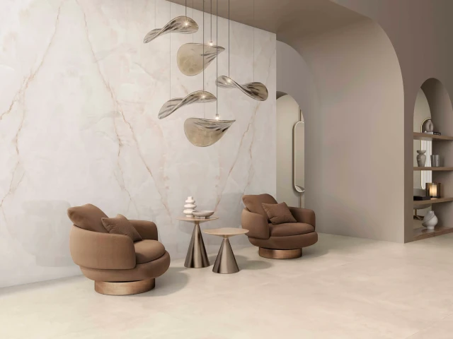 Projekt wyróżnia się wyjątkową interakcją ze światłem, które jest miękko wychwytywane i odbijane, potęgując efekt przestrzenności i lekkości. Dzięki tej właściwości Onice Lux White idealnie sprawdza się we wnętrzach, w których luksus ma być obecny w sposób nienachalny, ponadczasowy i harmonijny.