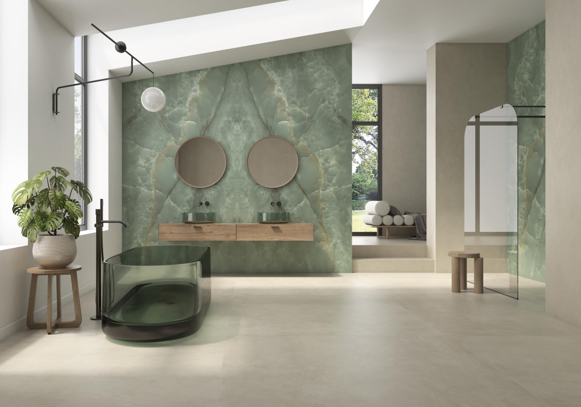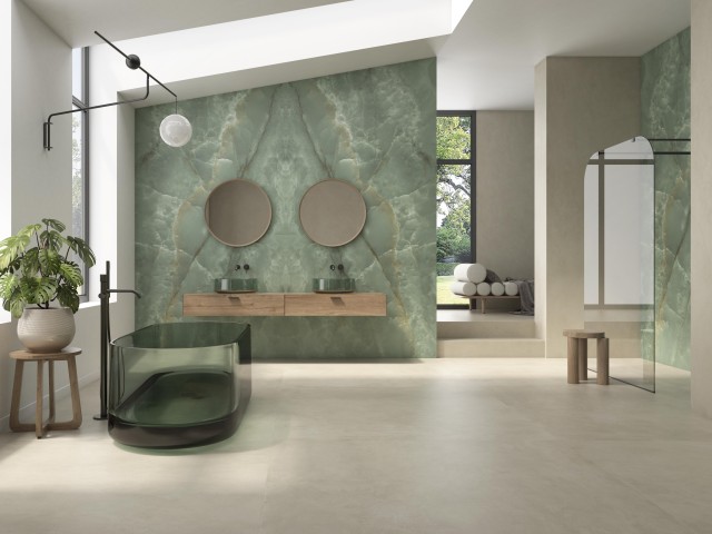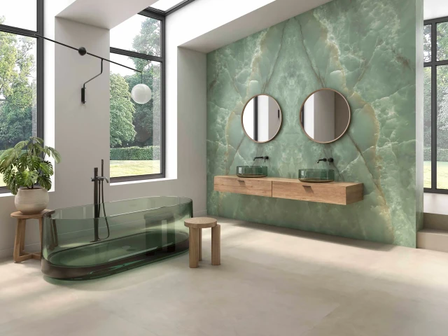 Dzięki wyrafinowanemu wykończeniu i unikalnemu odcieniowi zieleni, Onice Seagreen doskonale odnajduje się w projektach, które mają budować atmosferę relaksu, indywidualności i zmysłowego kontaktu z materiałem.