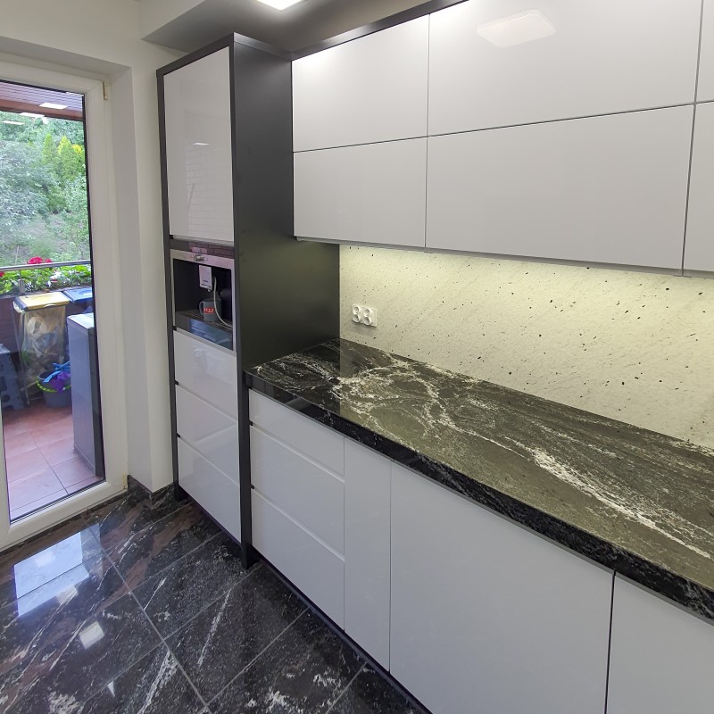 Granit Via Lactea to elegancki i wyjątkowy kamień naturalny o głębokiej, czarnej barwie, przeciętej delikatnymi, białymi żyłkami przypominającymi Drogę Mleczną. Jego kontrastowa, a zarazem subtelna estetyka nadaje wnętrzom nowoczesny i luksusowy charakter, doskonale komponując się zarówno z minimalistycznymi, jak i klasycznymi aranżacjami.