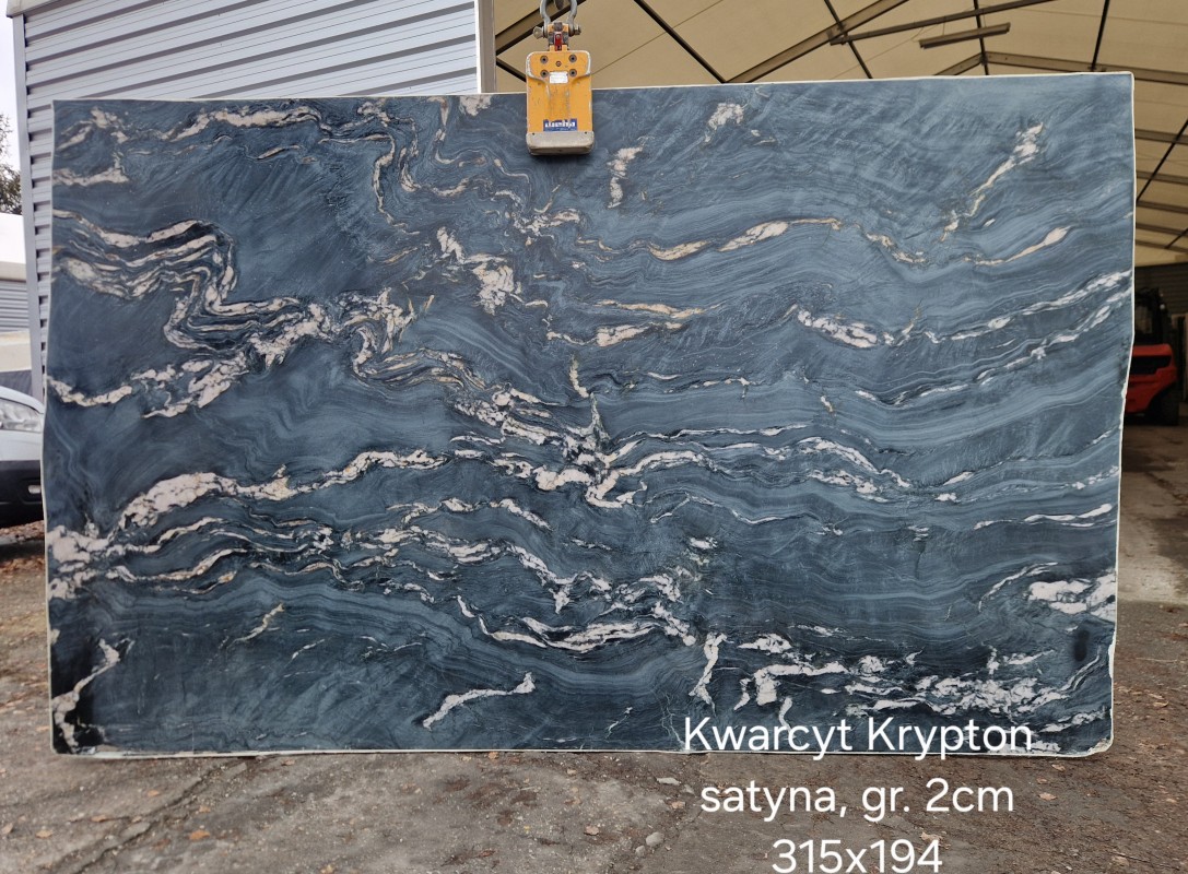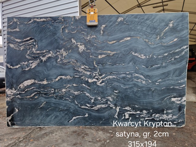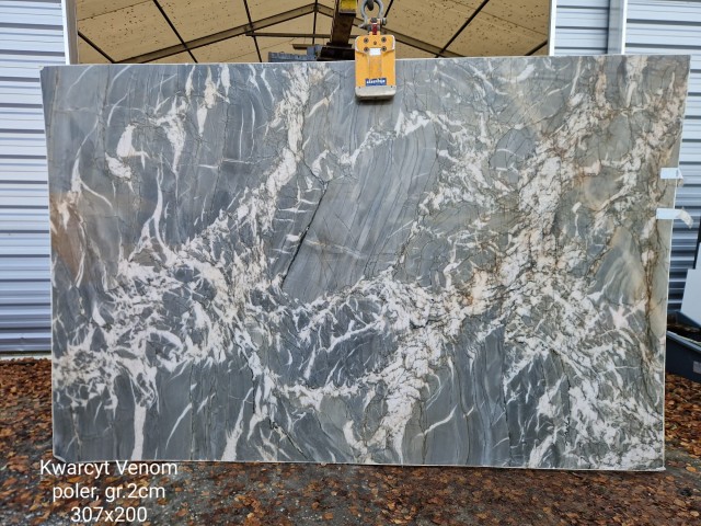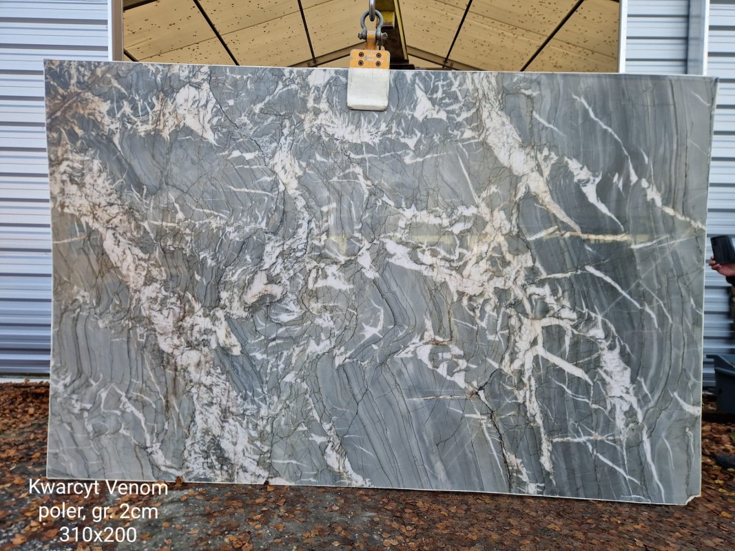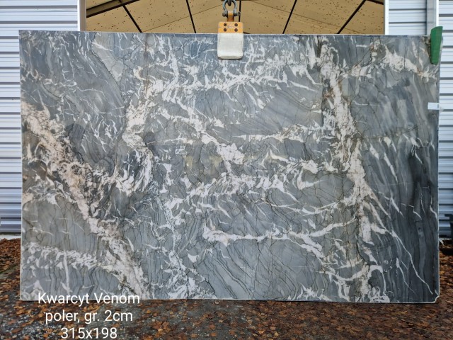 Kwarcyt Venom to kamień naturalny o głębokiej, ciemnozielonej barwie, która może przechodzić w odcienie grafitu, tworząc efekt mrocznej elegancji. Jego powierzchnia jest bogata w naturalne wzory, z wyraźnymi, jaśniejszymi żyłkami, które wyglądają jak "sącne" linie, nadając kamieniowi unikalny, niemal malarski wygląd. Żyłki te kontrastują z ciemniejszym tłem, a w niektórych miejscach pojawiają się także kryształowe, jasne akcenty, które nadają powierzchni subtelnego blasku i głębi. Te naturalne, jasne wtrącenia w postaci drobnych kryształków wzbogacają całość i sprawiają, że kwarcyt Venom jest niezwykle elegancki, a zarazem pełen charakteru.