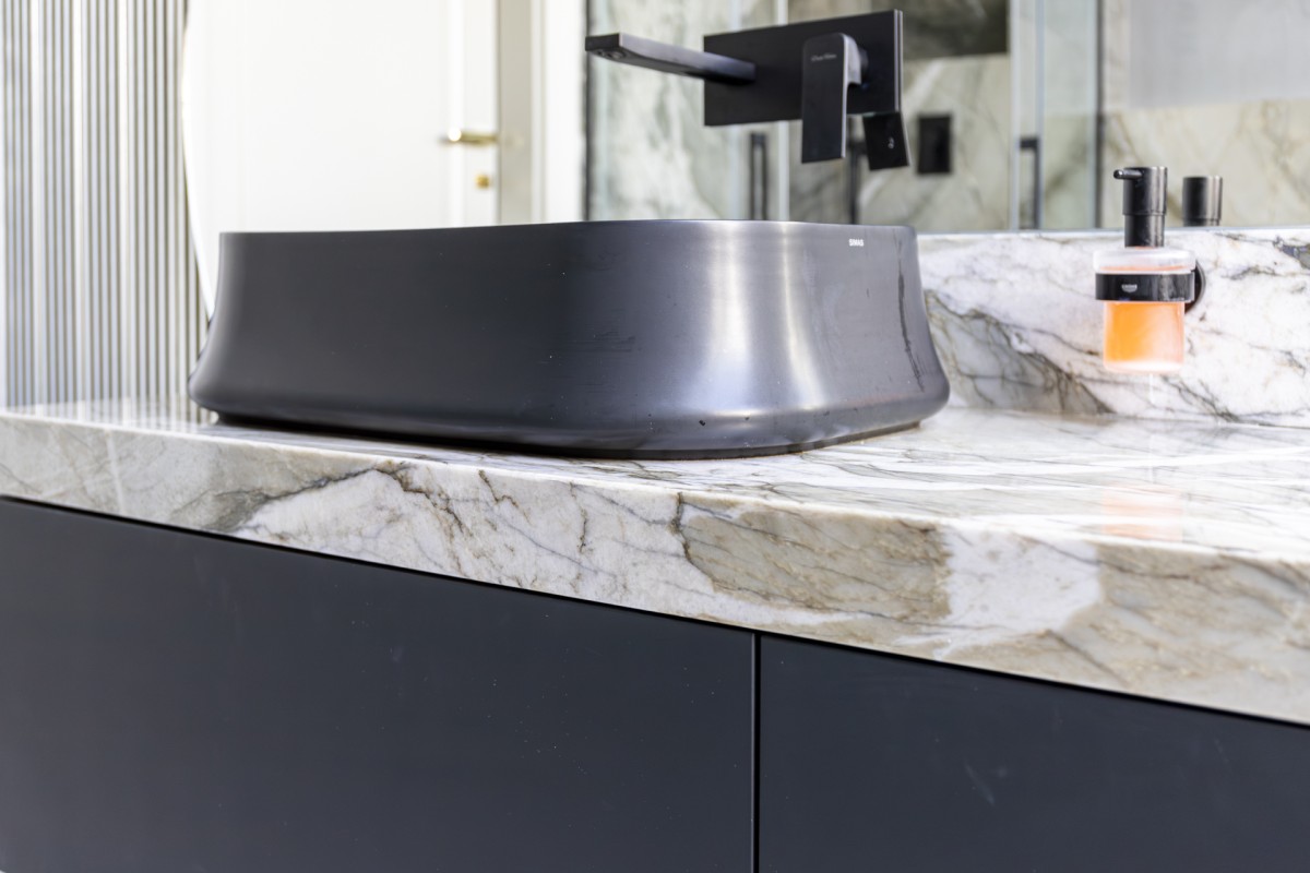 Jako materiał o wysokiej twardości, kwarcyt Venom jest wyjątkowo odporny na zarysowania, ścieranie oraz działanie wysokich temperatur, co czyni go niezwykle trwałym i praktycznym materiałem. Jego odporność na plamy oraz łatwość w utrzymaniu czystości sprawiają, że jest idealnym wyborem do powierzchni narażonych na intensywne użytkowanie, takich jak blaty kuchenne, posadzki, schody, parapety czy okładziny ścienne. Kwarcyt ten doskonale sprawdza się również w projektach wymagających wytrzymałości oraz estetyki, takich jak wnętrza komercyjne czy eleganckie przestrzenie publiczne. Jego ciemna, ale elegancka kolorystyka doskonale komponuje się z nowoczesnymi stylami aranżacyjnymi, a wyraziste żyłki oraz jasne akcenty sprawiają, że wnosi do wnętrz unikalny, artystyczny element.