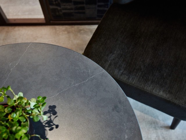 Silestone Charcoal Soapstone to elegancki konglomerat kwarcowy z kolekcji Eternal marki Cosentino, inspirowany naturalnym kamieniem łupkowym. Jego ciemnoszara baza z delikatnym, nieregularnym żyłkowaniem w odcieniach bieli i szarości nadaje wnętrzom nowoczesny i industrialny charakter.